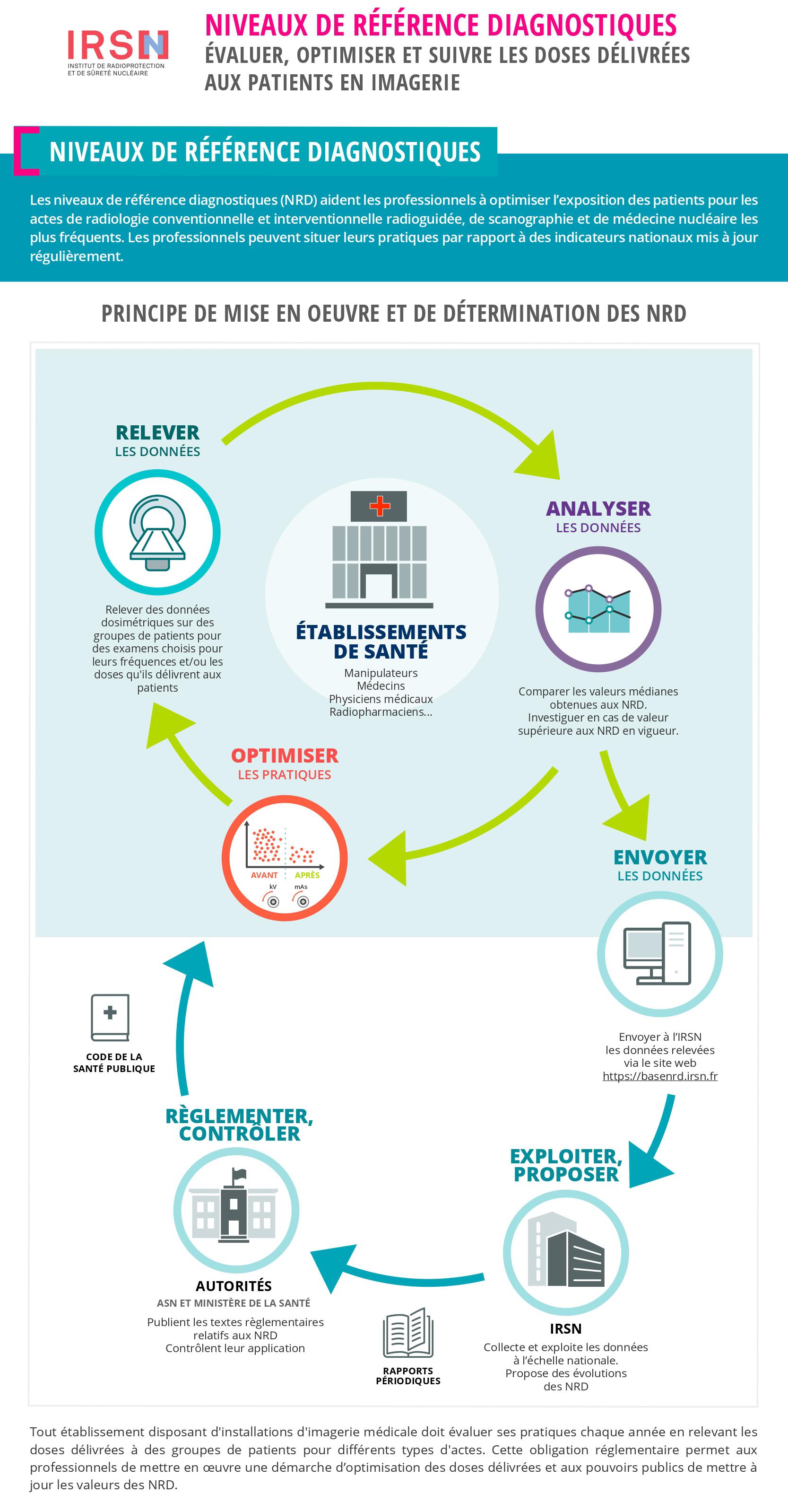 Les responsables d’activité nucléaire mettent en œuvre le recueil et la transmission des évaluations dosimétriques ainsi que l’analyse des résultats recueillis : comparaison de la médiane des évaluations aux valeurs du NRD et aux Valeurs Guide Diagnostiques (VGD) publiées, interprétation de la comparaison avec notamment la justification des éventuels dépassements, mise en place d’actions correctives. Les NRD constituent ainsi un outil pour l’optimisation des expositions des patients dans le domaine de l'imagerie médicale, c'est à dire la recherche du bon équilibre entre la dose délivrée au patient et la qualité de l'image nécessaire au médecin pour établir son diagnostic ou réaliser son intervention. Les NRD ne sont pas des limites d'exposition. Ils n'ont de sens que pour évaluer une pratique moyenne (à partir de groupes de patients) et ne doivent pas être comparés à l'exposition individuelle d'un patient.